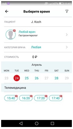 Здесь же выбираем конкретного доктора, который будет вас лечить. Прием ведут практикующие врачи клиник МЕДСИ, в приложении вы можете познакомиться с профилем каждого из специалистов, узнать их квалификацию, основные профессиональные компетенции, стаж работы и даже посмотреть фото.