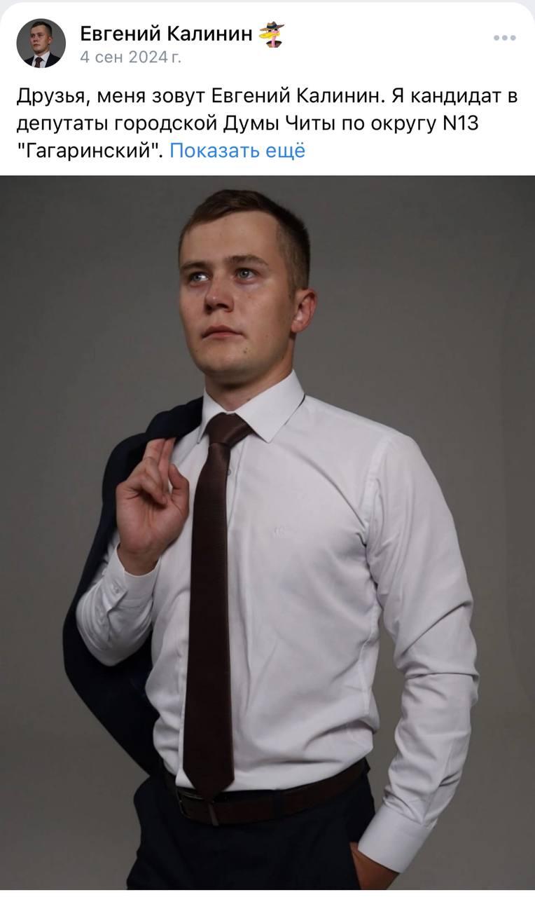 В 2024 году Калинин решил принять участие в выборах в городскую думу Читы. Он состоял в партии «Единая Россия», но в Гордуму пошёл, как самовыдвиженец. На его странице во «Вконтакте», как будто бы не существует жизни «до», посты и фотки начинаются с периода предвыборной кампании, где он активно участвует в социальной и общественной жизни Гагаринского округа: встречается с жильцами домов, восстанавливает памятники, убирается, проводит праздники двора.