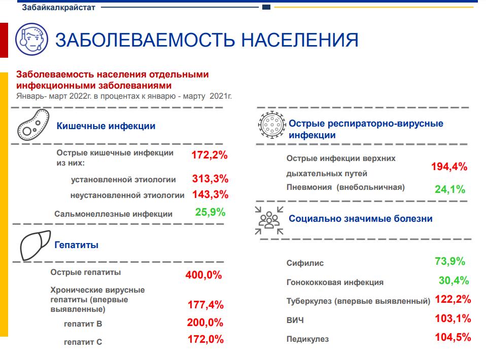 «В январе-марте 2022 года эпидемиологическая обстановка характеризовалась ростом заболеваемости населения острыми гепатитами, острыми инфекциями верхних дыхательных путей, хроническими вирусными гепатитами, острыми кишечными инфекциями», - говорится в сообщении.