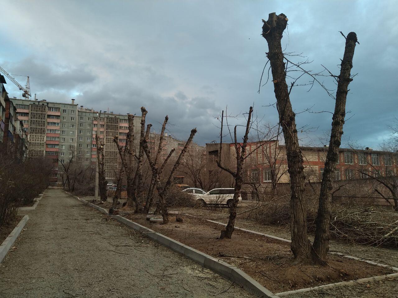 Тополя во дворе по улице Нечаева, 115 в Чите превратились в «изуродованные» столбы, сообщил корреспонденту ZAB.RU очевидец 14 октября.