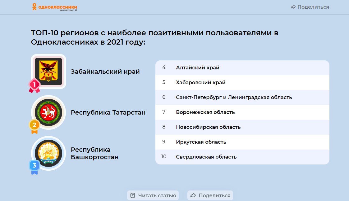 Общество 22:44 В сети «ОК» забайкальцев считают самыми позитивными пользователями Комментарии, оценки и фотографии – за счет чего Забайкальский край стал самым позитивным регионом в России