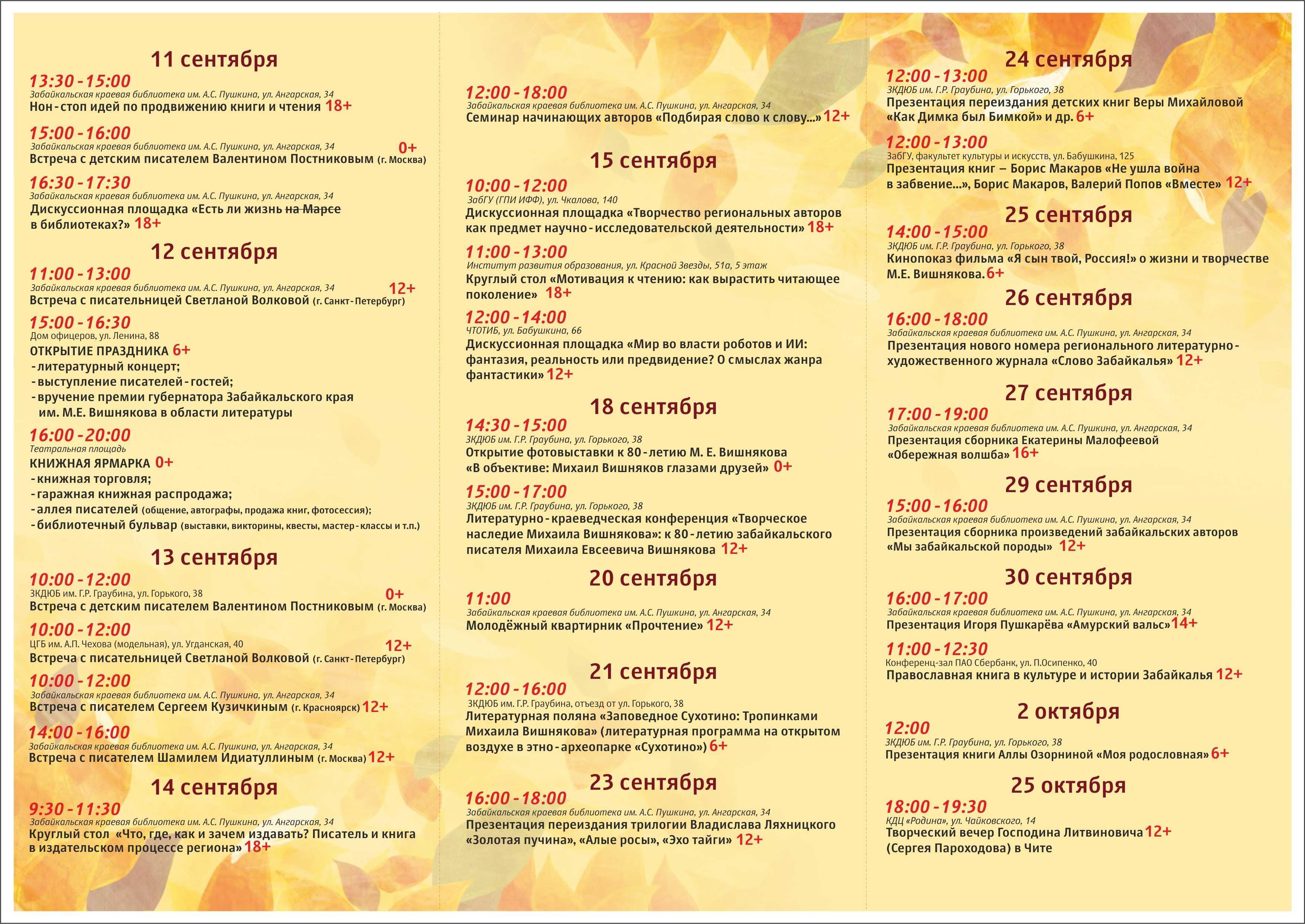 11:00–13:00 — встреча с писательницей Светланой Волковой (Санкт-Петербург) (12+) в библиотеке Пушкина;
